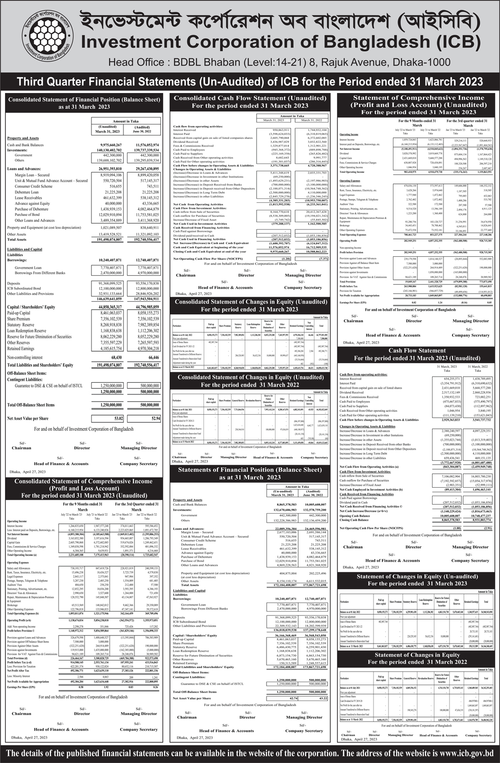 Q3 Un-audited Financial Statements of Investment Corporation of Bangladesh