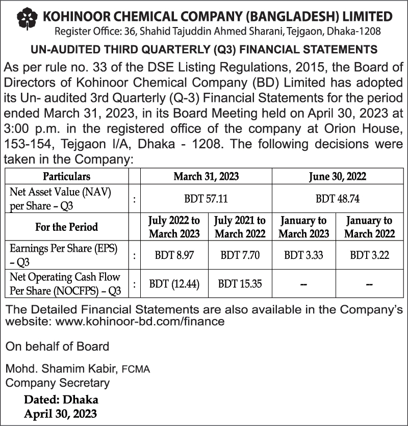 Un-audited Q3 Financial Statements of Kohinoor Chemicals Company (Bangladesh) Ltd.