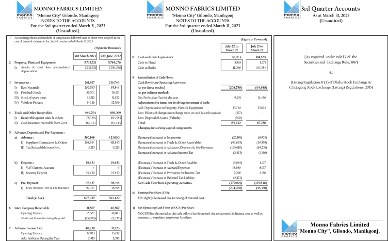 Un-audited Q3 Financial Statements of Monno Fabrics Limited
