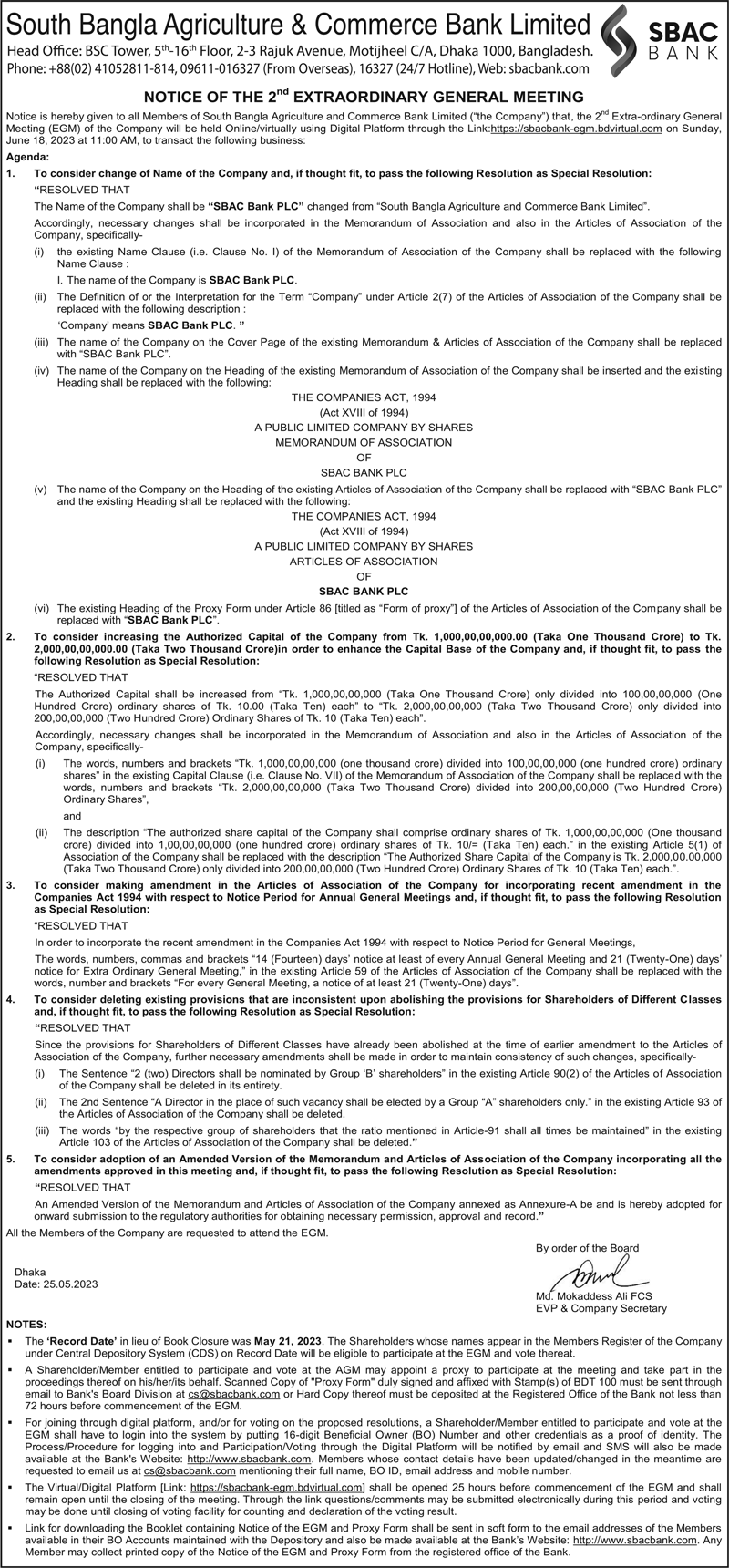 Notice of the 2nd EGM of SBAC Bank