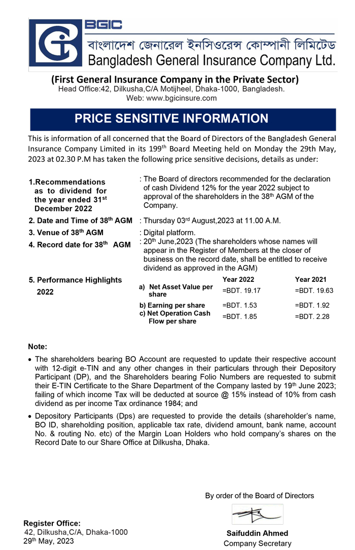 Price Sensitive Information of Bangladesh General Insurance Company Ltd