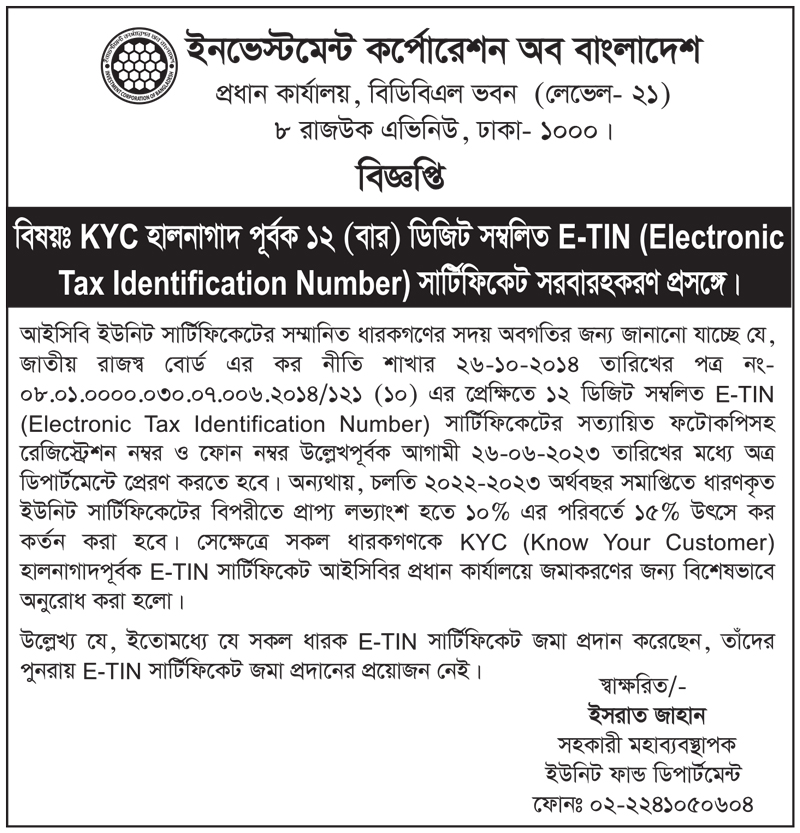আইসিবি ইউনিট সার্টিফিকেটের KYC পূর্বক ১২ ডিজিট E-TIN সার্টিফিকেট সরবরাহরণ প্রসঙ্গে