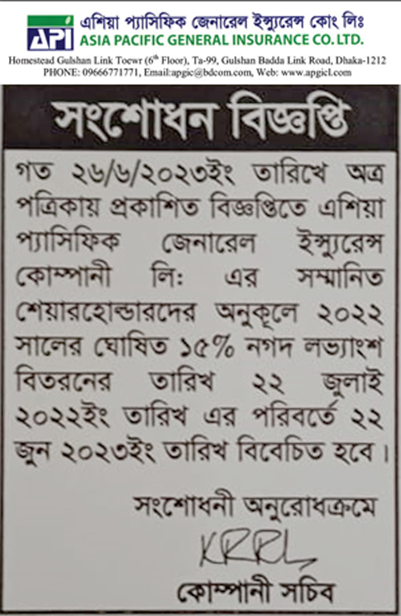 এশিয়া প্যাসিফিক জেনারেল ইন্স্যুরেন্স এর সংশোধনী বিজ্ঞপ্তি