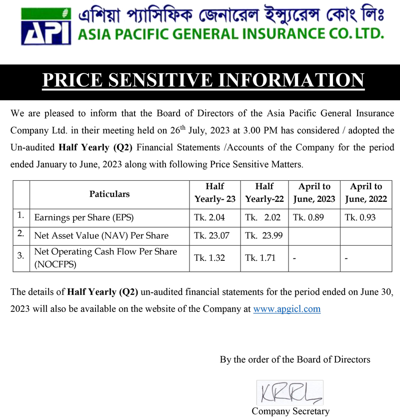 Price Sensitive Information of Asia Pacific General Insurance Company Limited