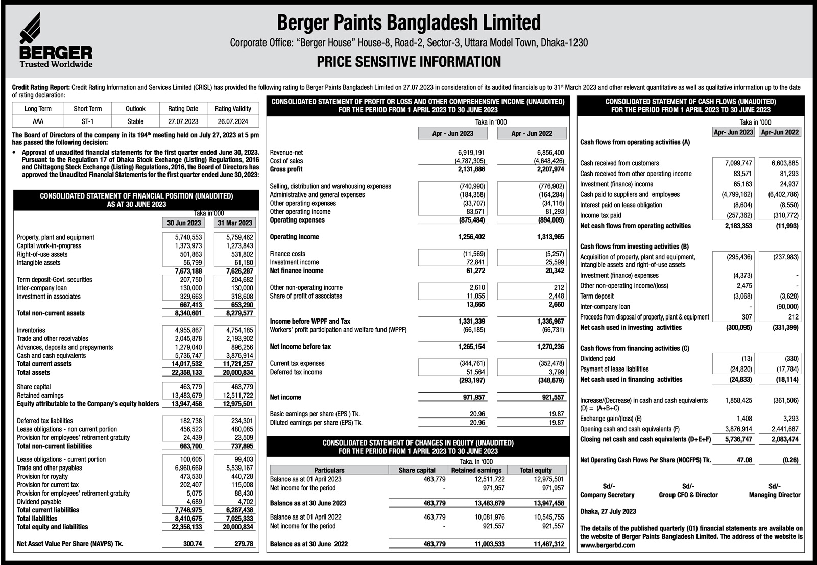 Price Sensitive Information of Berger Paints Bangladesh Ltd