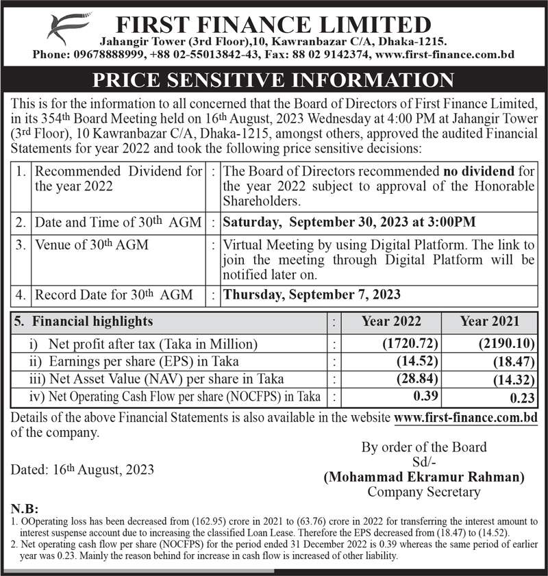 Price Sensitive Information of First Finance Limited