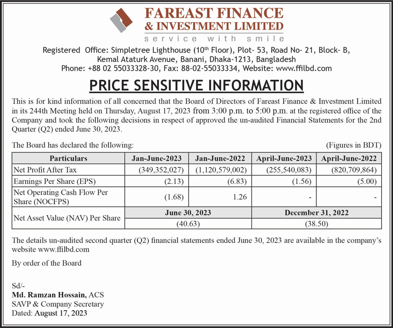 Price Sensitive Information (Q2) of Fareast Finance & Investment Limited