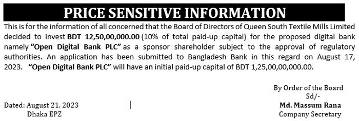 Price Sensitive Information of Queen South Textile Mills Ltd.