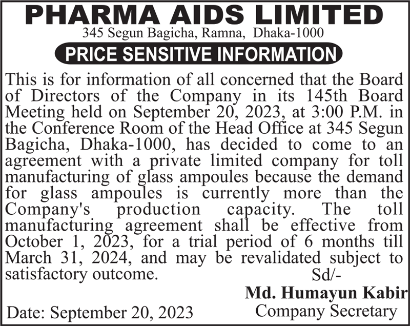 Price Sensitive Information of Pharma Aids Ltd.