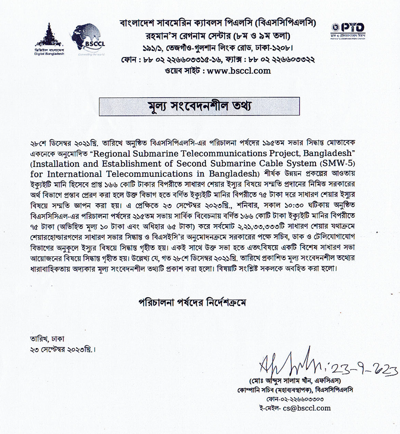 Price Sensitive Information of Bangladesh Submarine Cables PLC