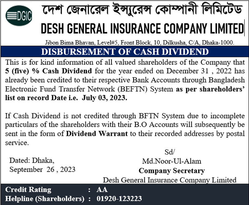 Disbursement of Cash Dividend of Desh General Insurance Company Limited