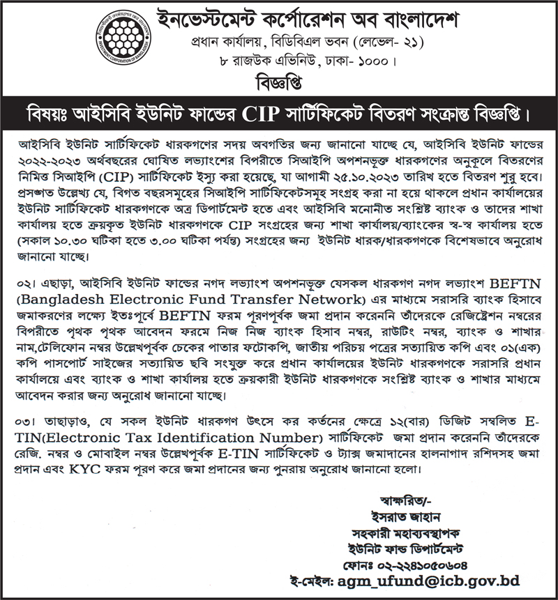 আইসিবি ইউনিট ফান্ডের CIP সার্টিফিকেটের বিতরণ সংক্রান্ত বিজ্ঞপ্তি