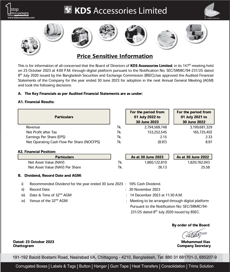 Price Sensitive Information of KDS Accessories Limited