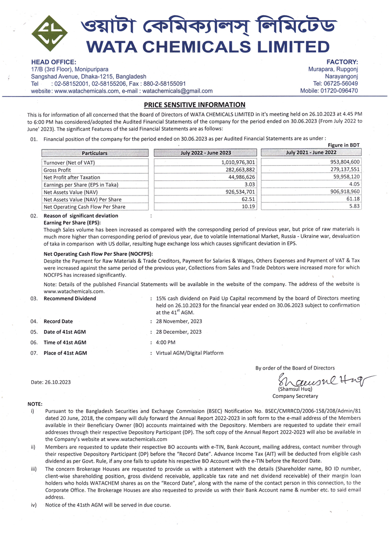 Price Sensitive Information of Wata Chemicals Limited
