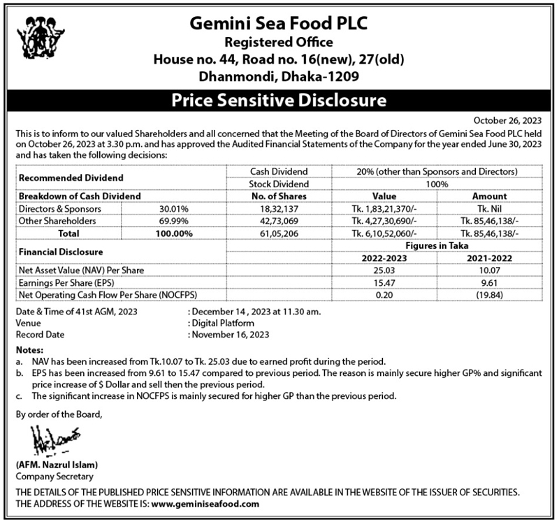 Price Sensitive Disclose of Gemini Sea Food Limited