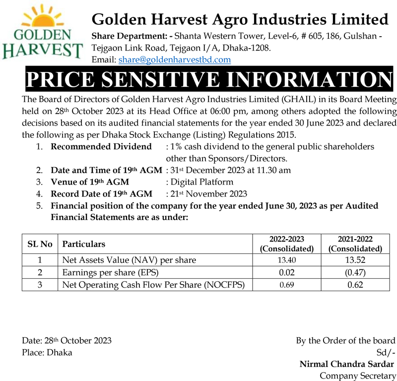Price Sensitive Information of Golden Harvest Agro Industries Limted