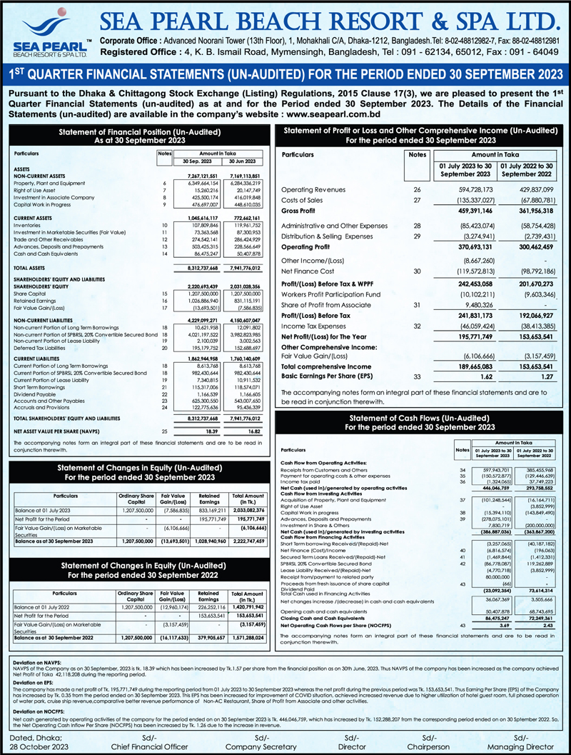 Q1 Un-audited Financial Statements of Sea Pearl Beach Resort & SPA Ltd.