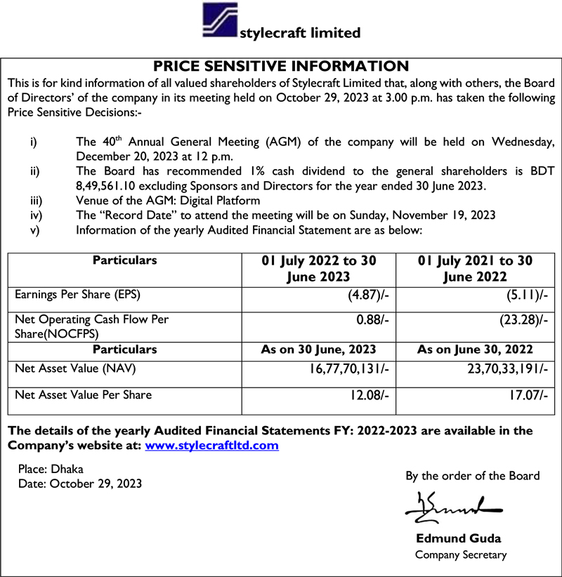 Price Sensitive Information of Stylecraft Limited