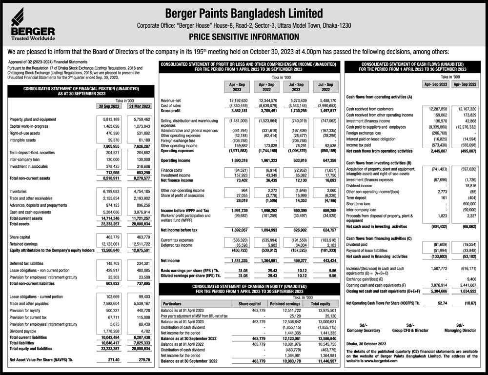 Price Sensitive Information of Berger Paints Bangladesh Ltd