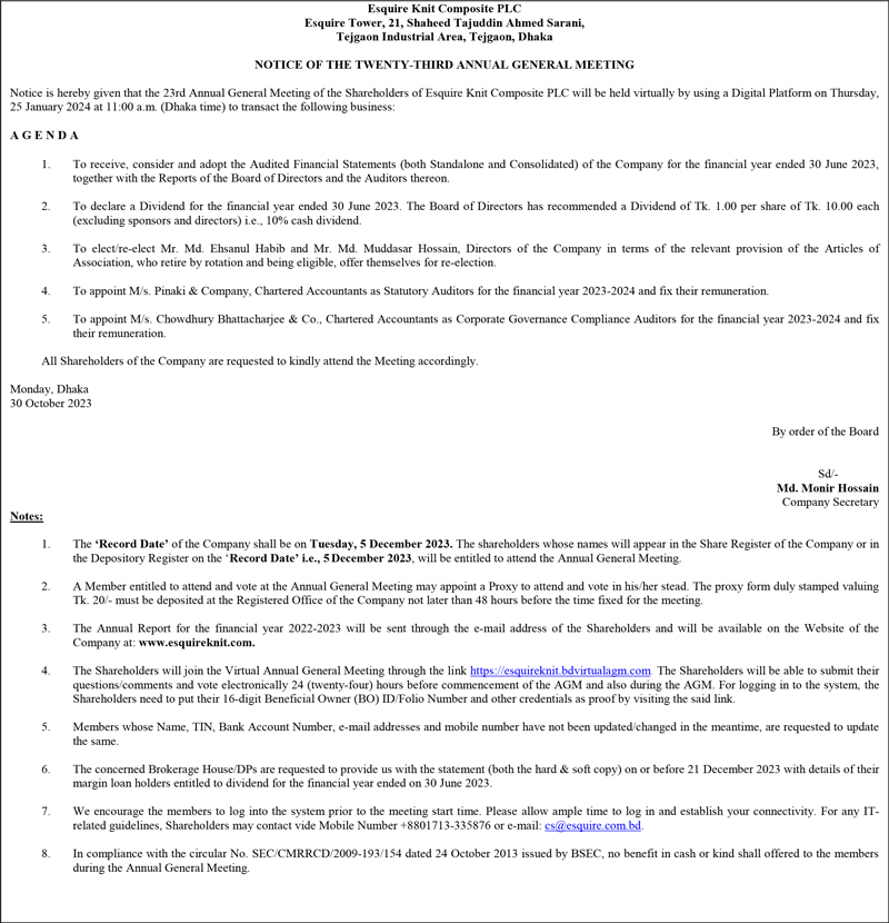 Notice of the 23rd AGM of Esquire Knit Composite PLC