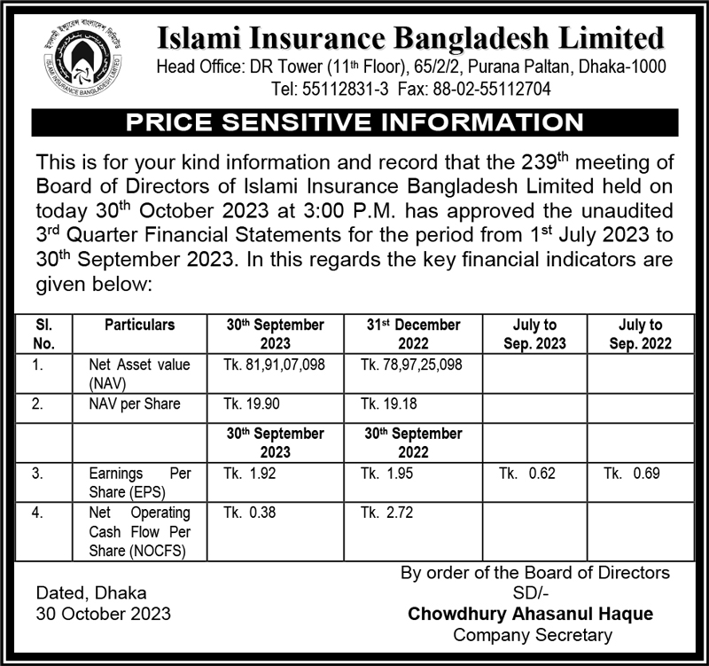 Price Sensitive Information of Islami Insurance Bangladesh Limited