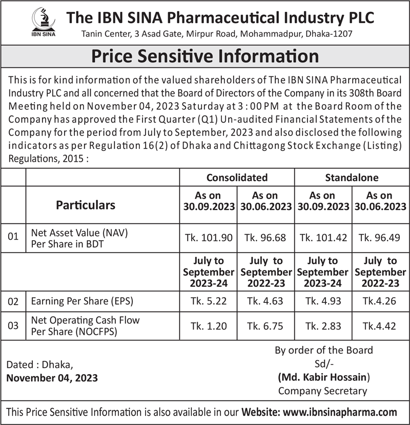 Price Sensitive Information (Q1) of The IBN SINA Pharmaceutical Industry PLC