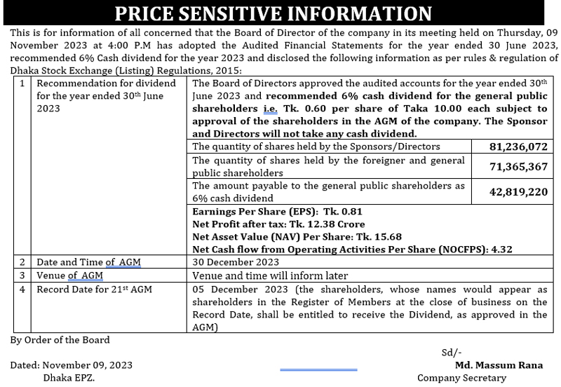 Price Sensitive Information of Queen South Textile Mills Ltd.