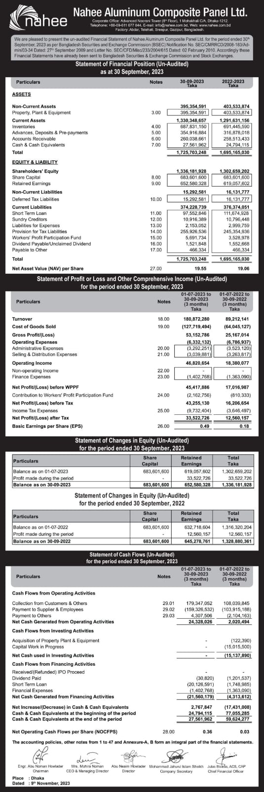 Statements of Financial Position (Un-audited) of Nahee Aluminum Composite Panel Ltd