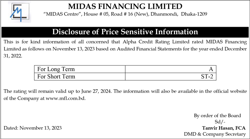 Disclosure of Price Sensitive Information of MIDAS Financing Limited