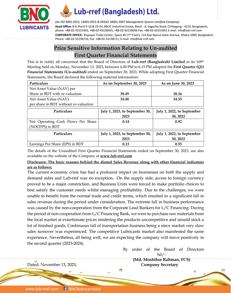 Price Sensitive Information of Lub-rref (Bangladesh) Ltd.