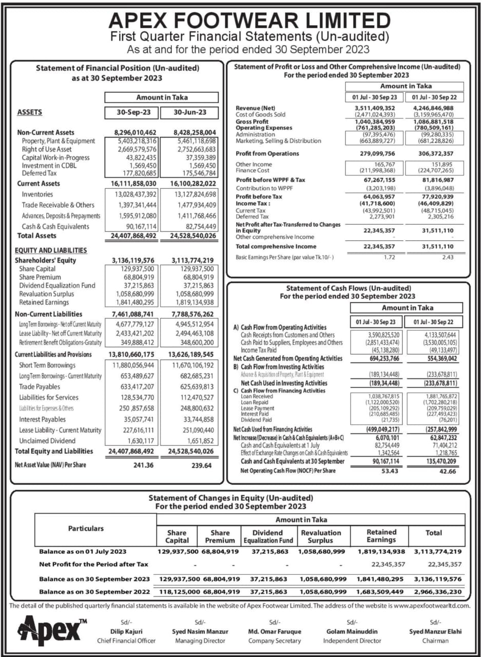 Q1 Financial Statement of Apex Footwear Limited