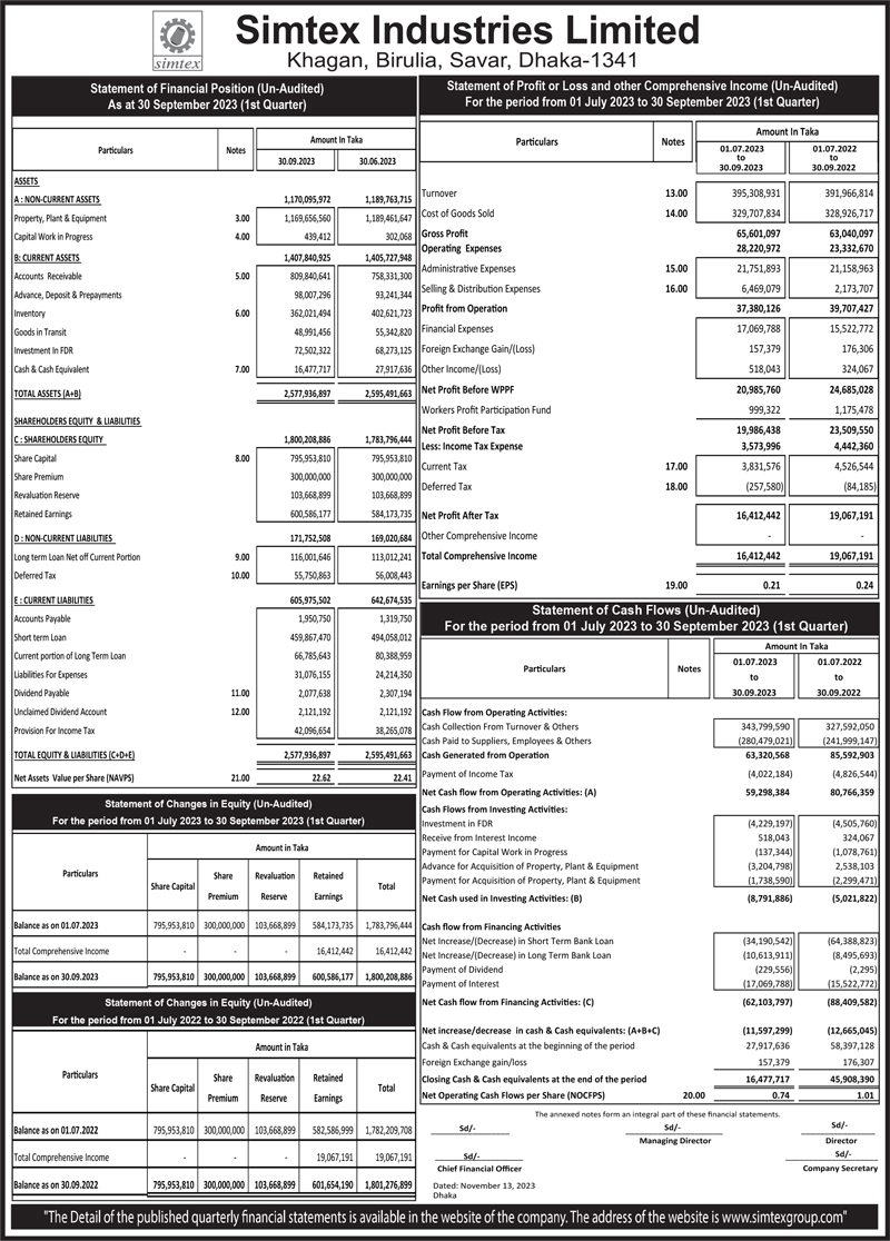 Q1 Financial Statements of Simtex Industries Limited