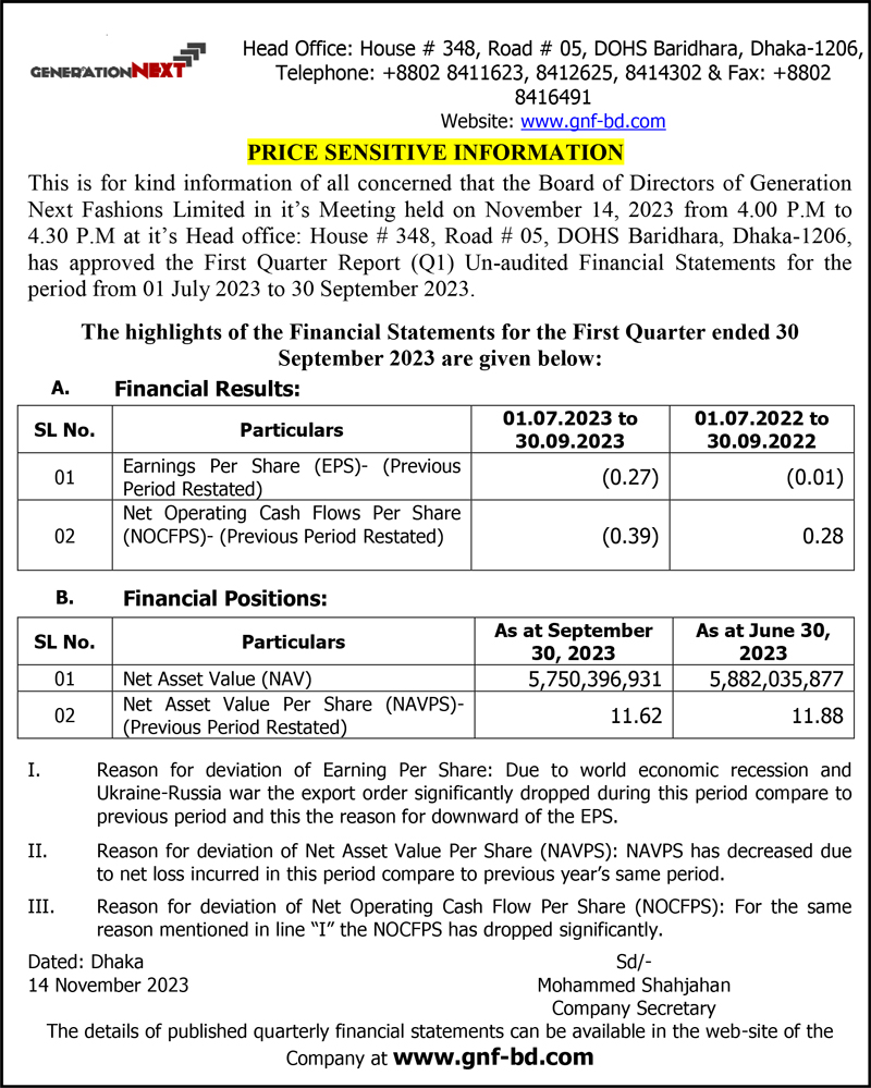 Price Sensitive Information of Generation Next Fashions Limited
