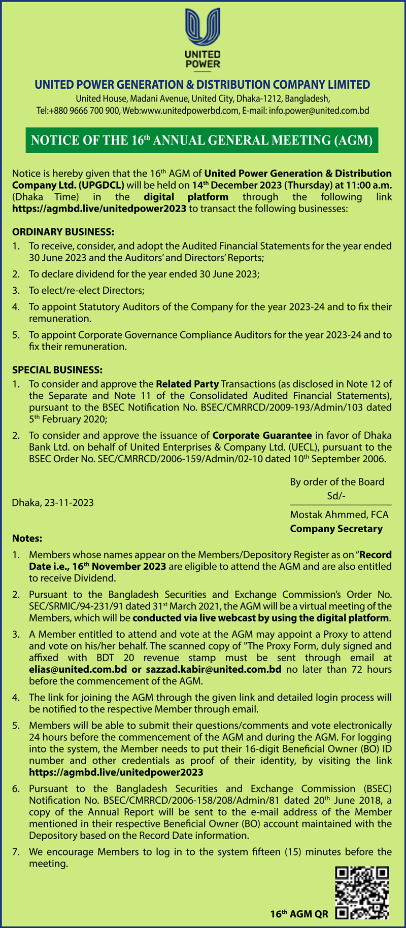 Notice of the 16th AGM of United Power Generation & Distribution Company Ltd.