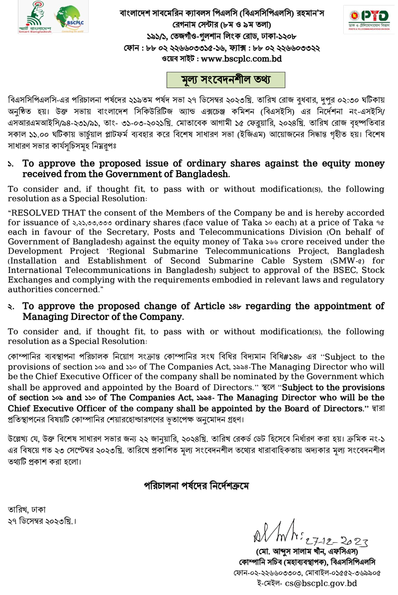 Price Sensitive Information of Bangladesh Submarine Cable PLC