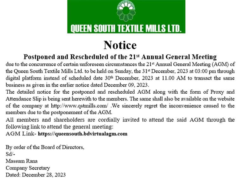 Notice (Postponed and Rescheduled) of the 21st AGM of Queen South Textile Mills Ltd.