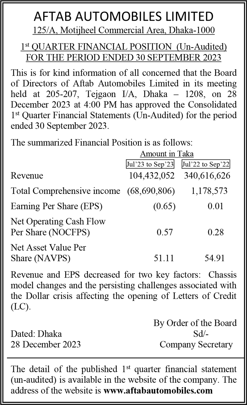 Q1 Un-audited Financial Statements of Aftab Automobiles Limited