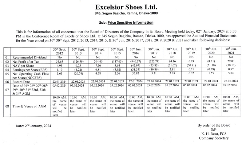 Price Sensitive Information of Excelsior Shoes Ltd.