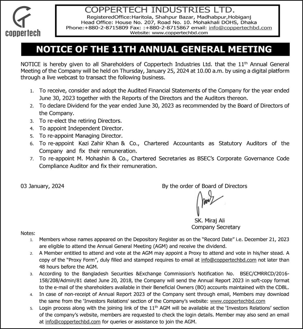 Notice of the 11th AGM of Coppertech Industries Ltd.
