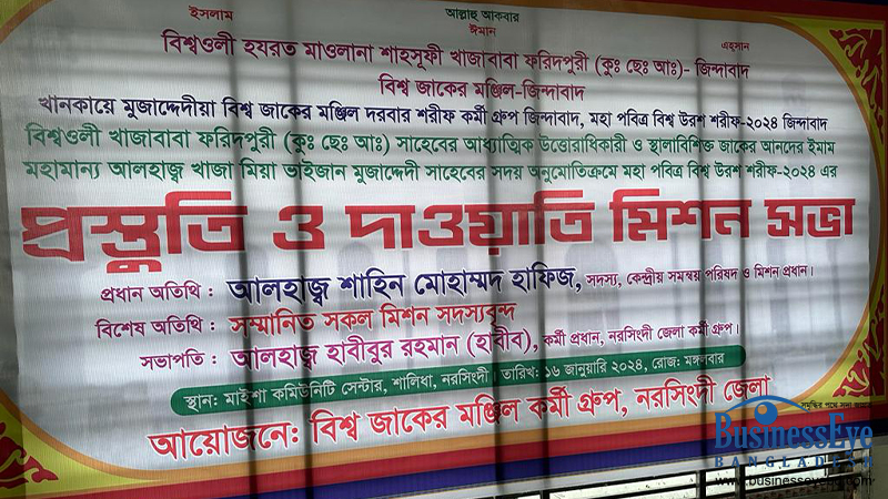 উল্লেখ্য যে আগামী ১৭,১৮,১৯ ও ২০ ফেব্রুয়ারী যথাক্রমে শনি, রবি, সোম ও মঙ্গলবার বিশ্ব জাকের মঞ্জিল দরবার শরীফে বিশ্বওলী খাজাবাবা ফরিদপুরী (কুঃছেঃআঃ) ছাহেবের মহা পবিত্র বিশ্ব উরস শরীফ ২০২৪ইং যথাযথ ধর্মীয় ভাবগাম্ভীর্যের সাথে মহা ধুমদামে অনুষ্ঠিত হবে। এ উপলক্ষ্যে সারা দেশে বিশ্ব জাকের মঞ্জিল দরবার শরীফ কর্মী গ্রুপের উদ্যোগে জেলা ও মহানগর পর্যায়ে উরস শরীফ কে কেন্দ্র করে দাওয়াতি মিশন সভা অনুষ্ঠিত হচ্ছে।