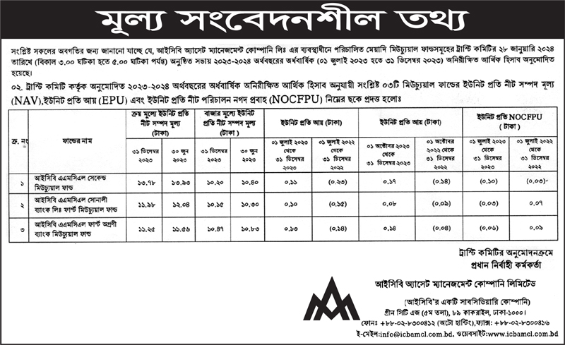 আইসিবি এএমসিএল এর ব্যবস্থাধীনে পরিচালিত সিডিএসভুক্ত ৩টি মিউচ্যুয়াল ফান্ডের মূল্য সংবেদনশীল সংক্রান্ত তথ্য