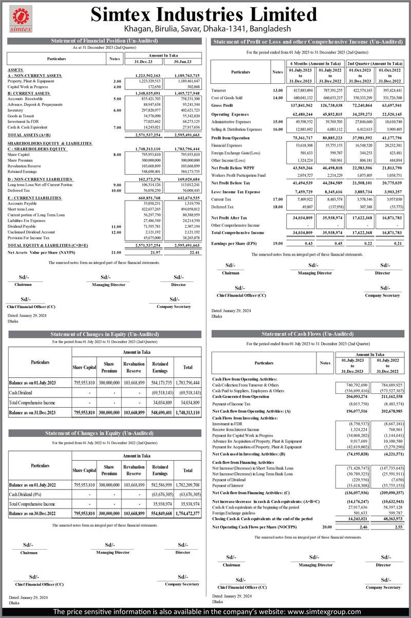 Statements of Financial Position (An-audited) of Simtex Industries Limited
