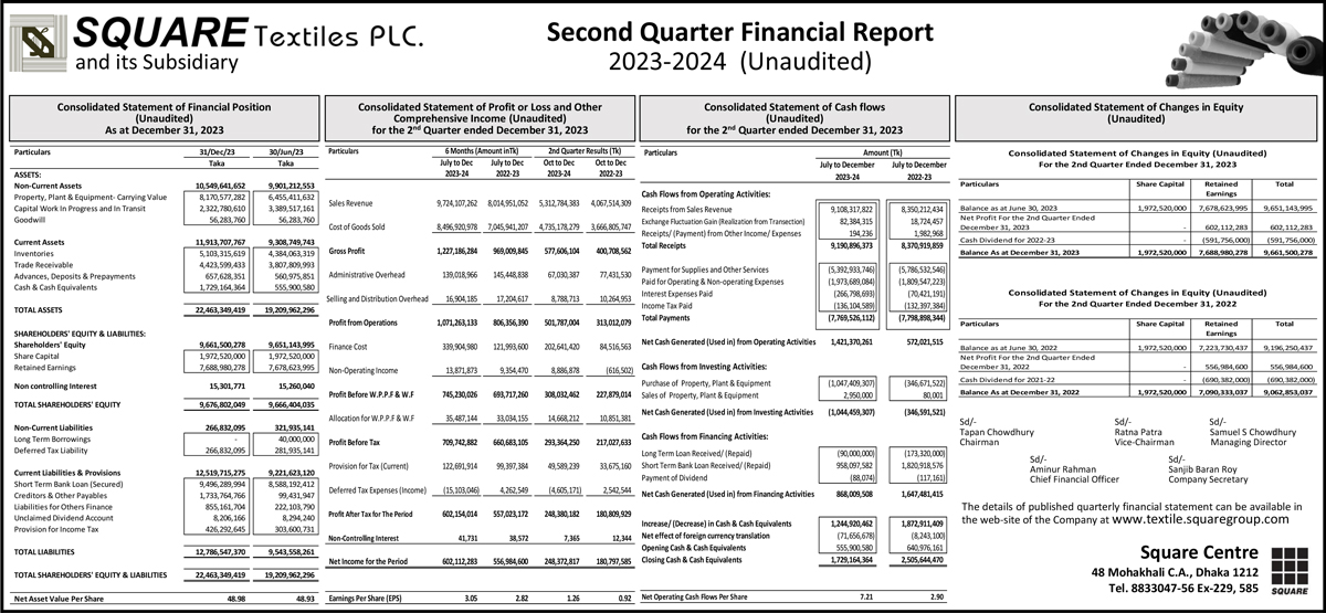 Q2 Financial Statements (Unaudited) of Square Textiles PLC