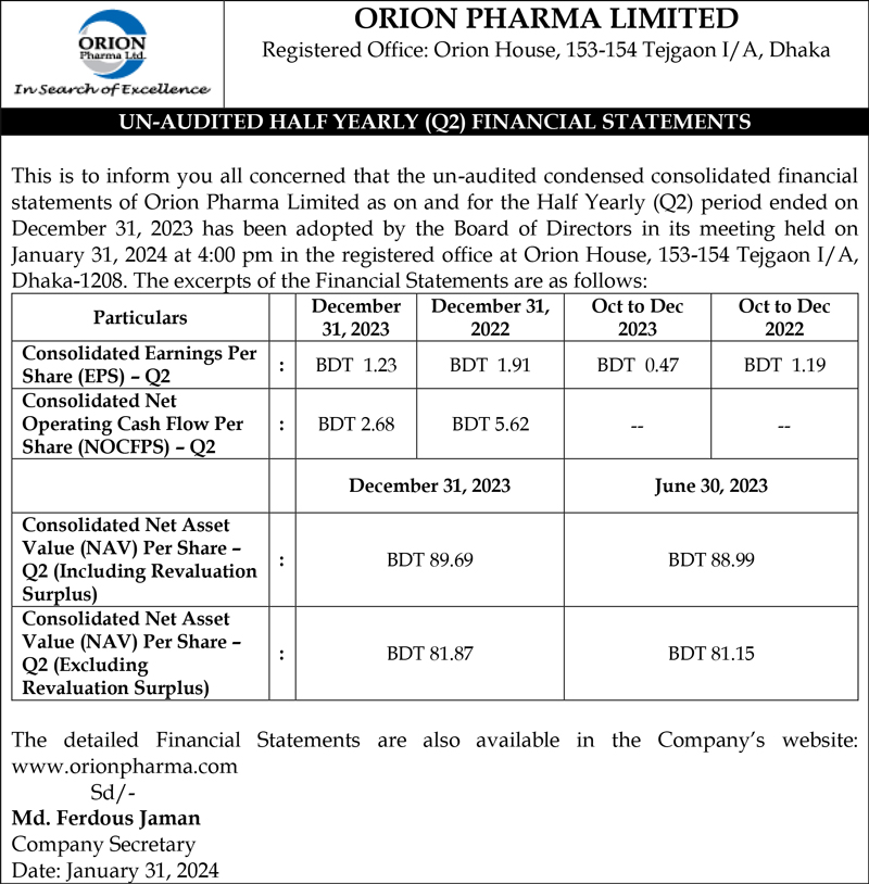 Un-audited Half Yearly (Q2) Financial Statements of Orion Pharma Ltd