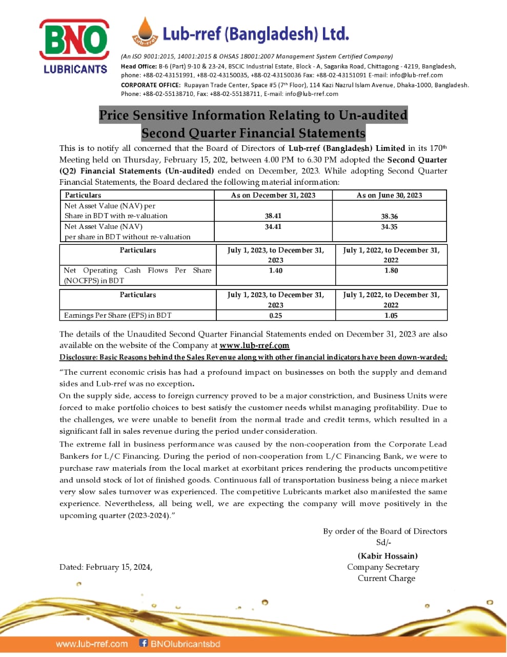 Price Sensitive Information of Lub-rref (Bangladesh) Ltd