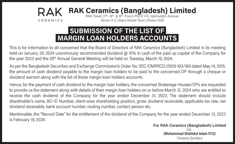 Submission of the List of Margin Loan Holders Accounts of RAK Ceramics (Bangladesh) Limited