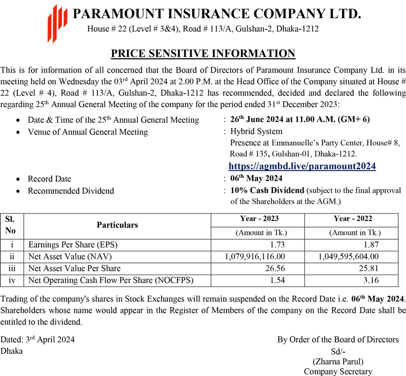Price Sensitive Information of Paramount Insurance Company Ltd.