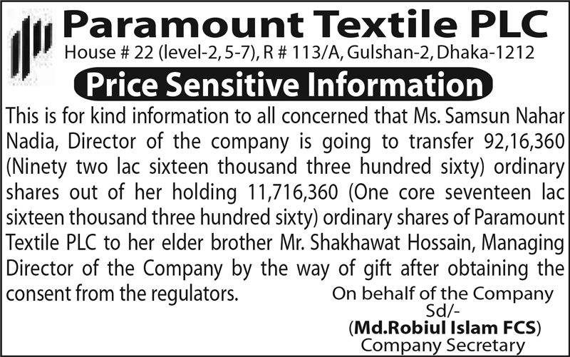 Price Sensitive Information of Paramount Textile PLC