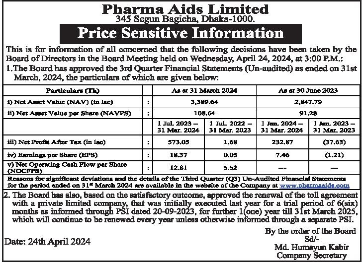 Price Sensitive Information of Pharma Aids Limited
