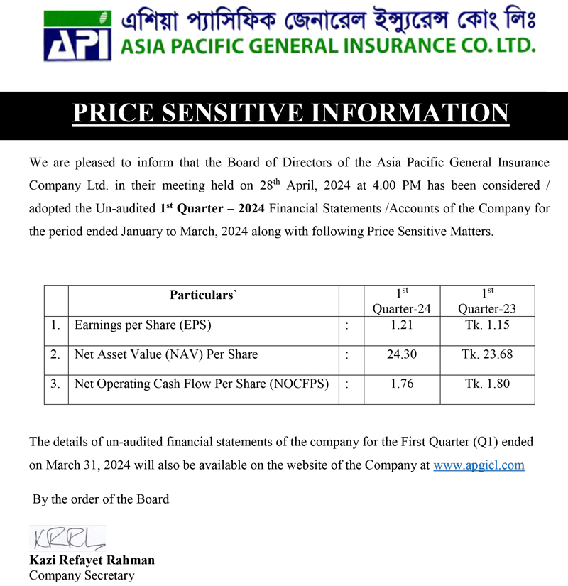Q1 Financial Statements of Asia Pacific General Insurance Co. ltd